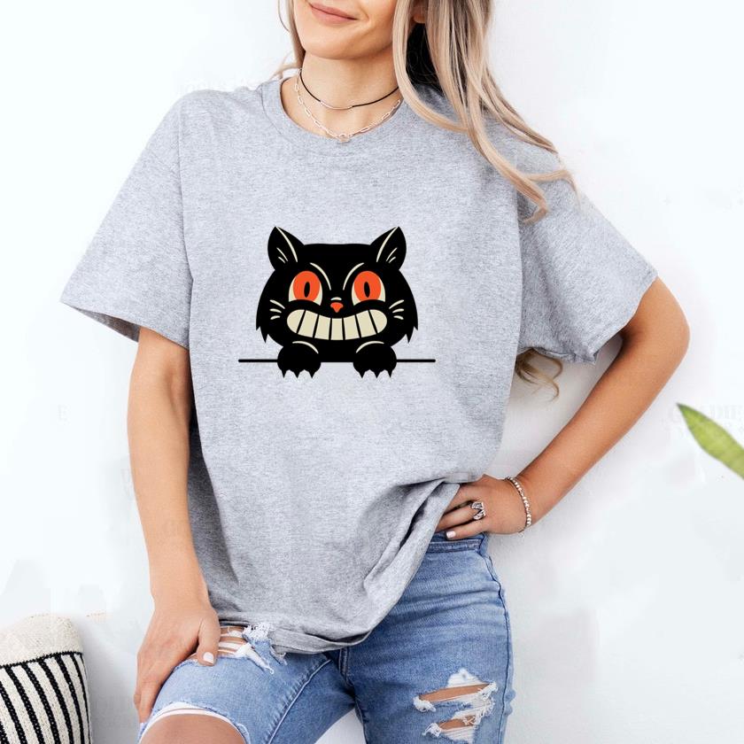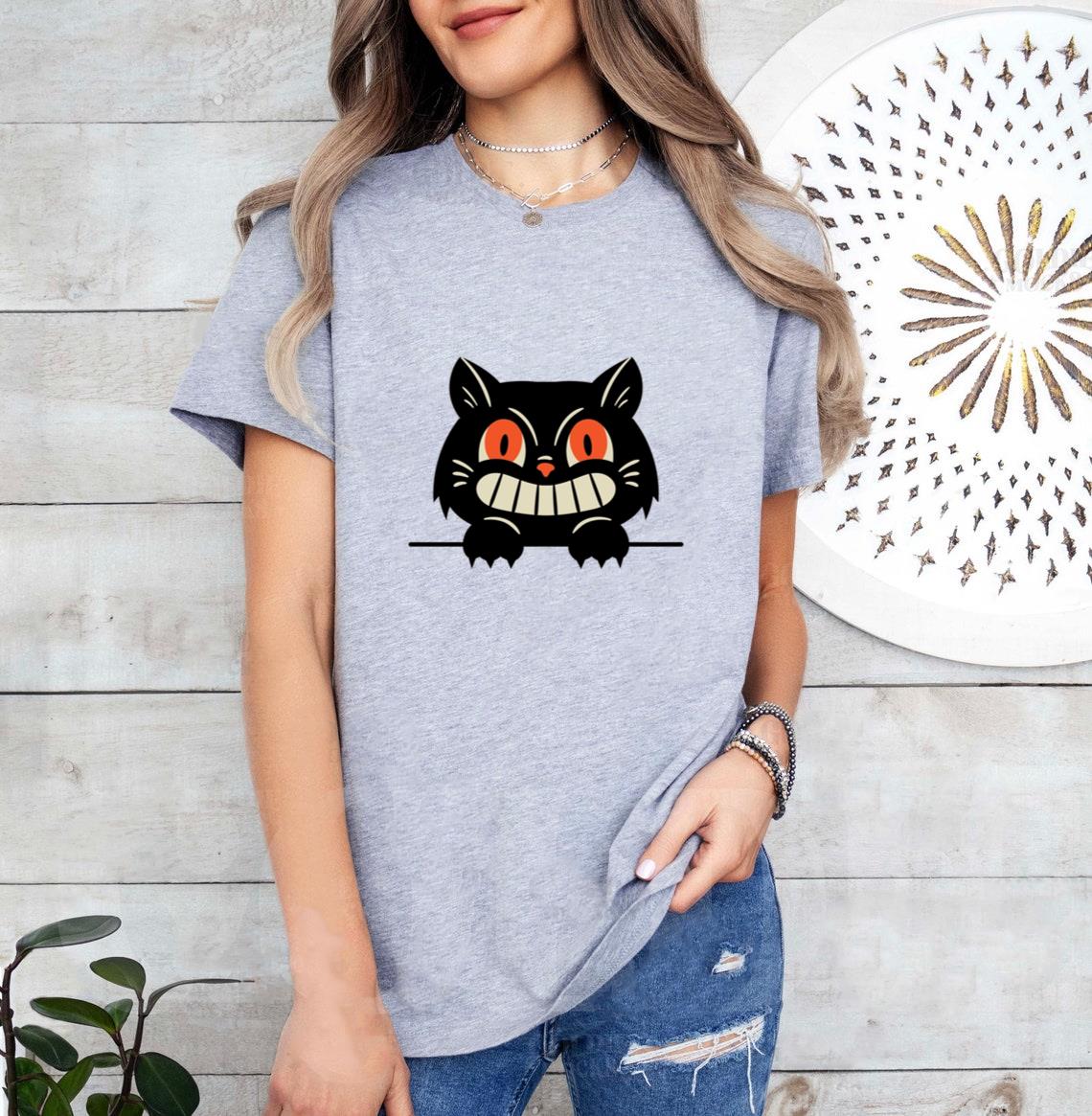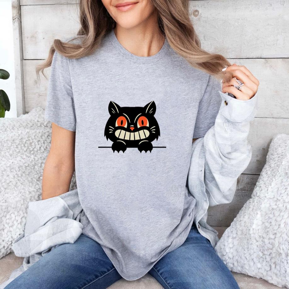 Comfy, casual, and always in style, this Black Cat With Red Eyes And A Smile Design T-Shirt T-shirt is perfect for daily wear or easy gifting.